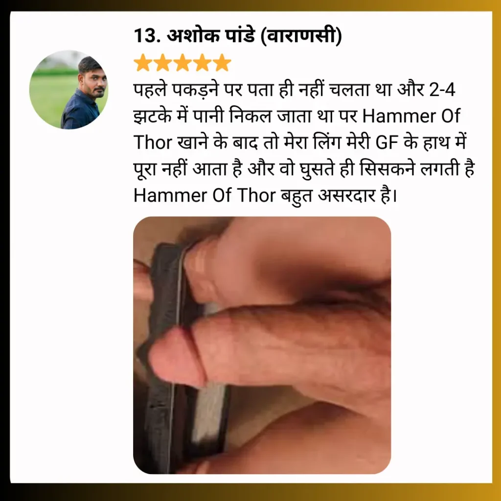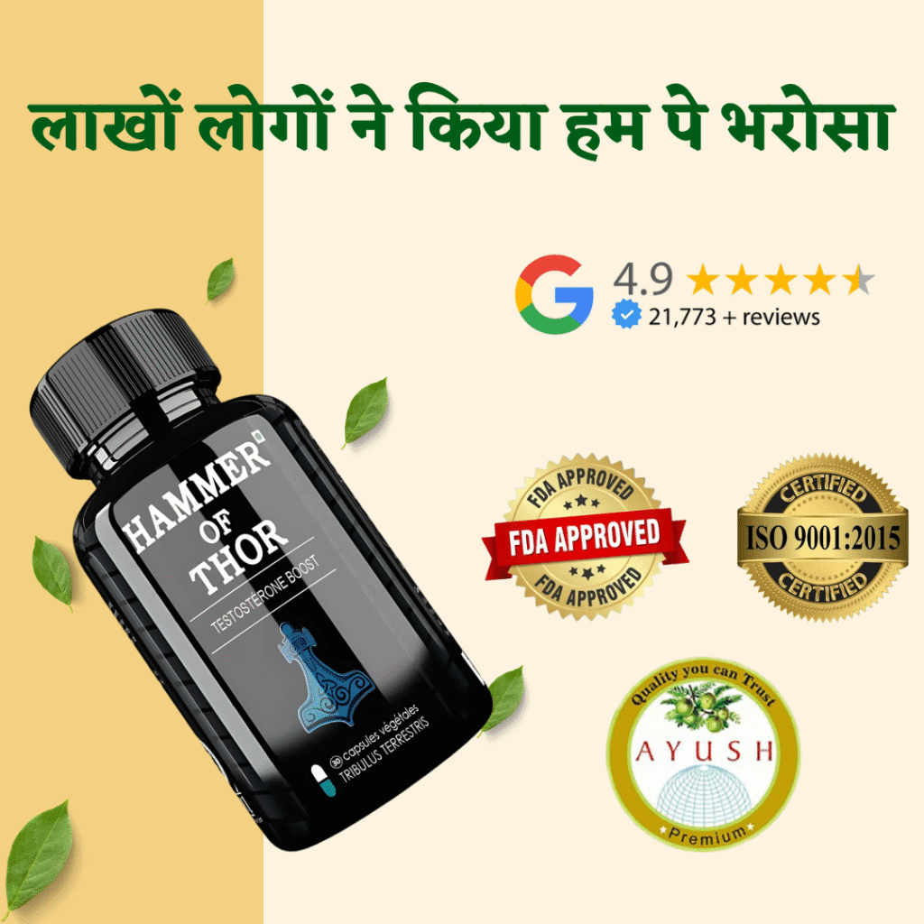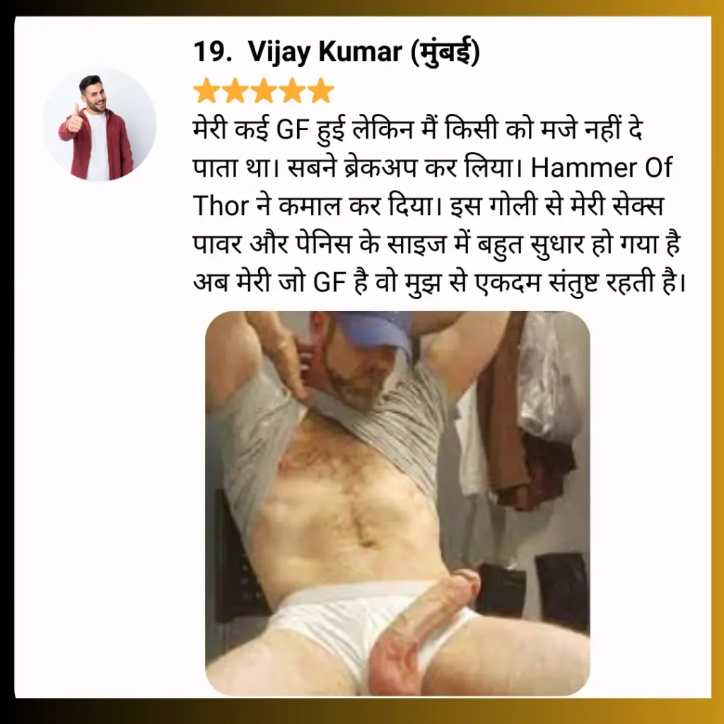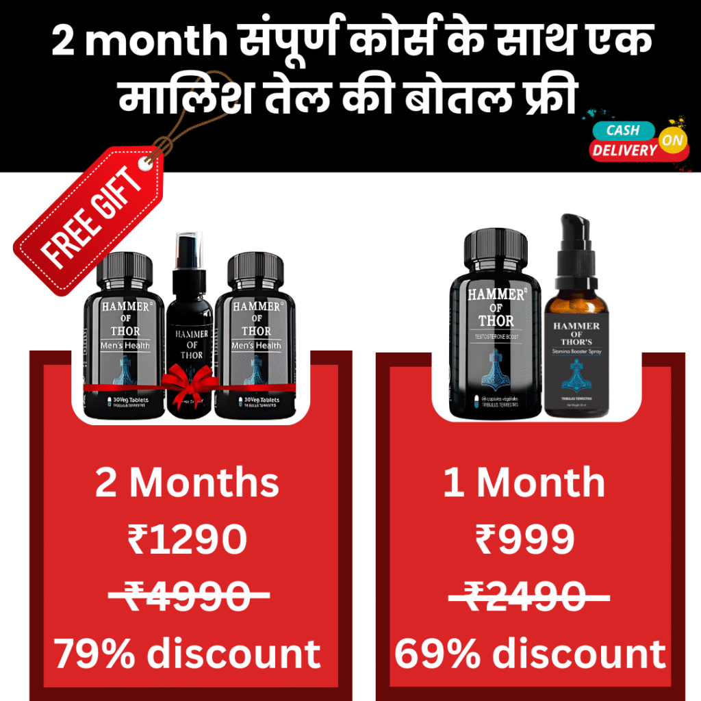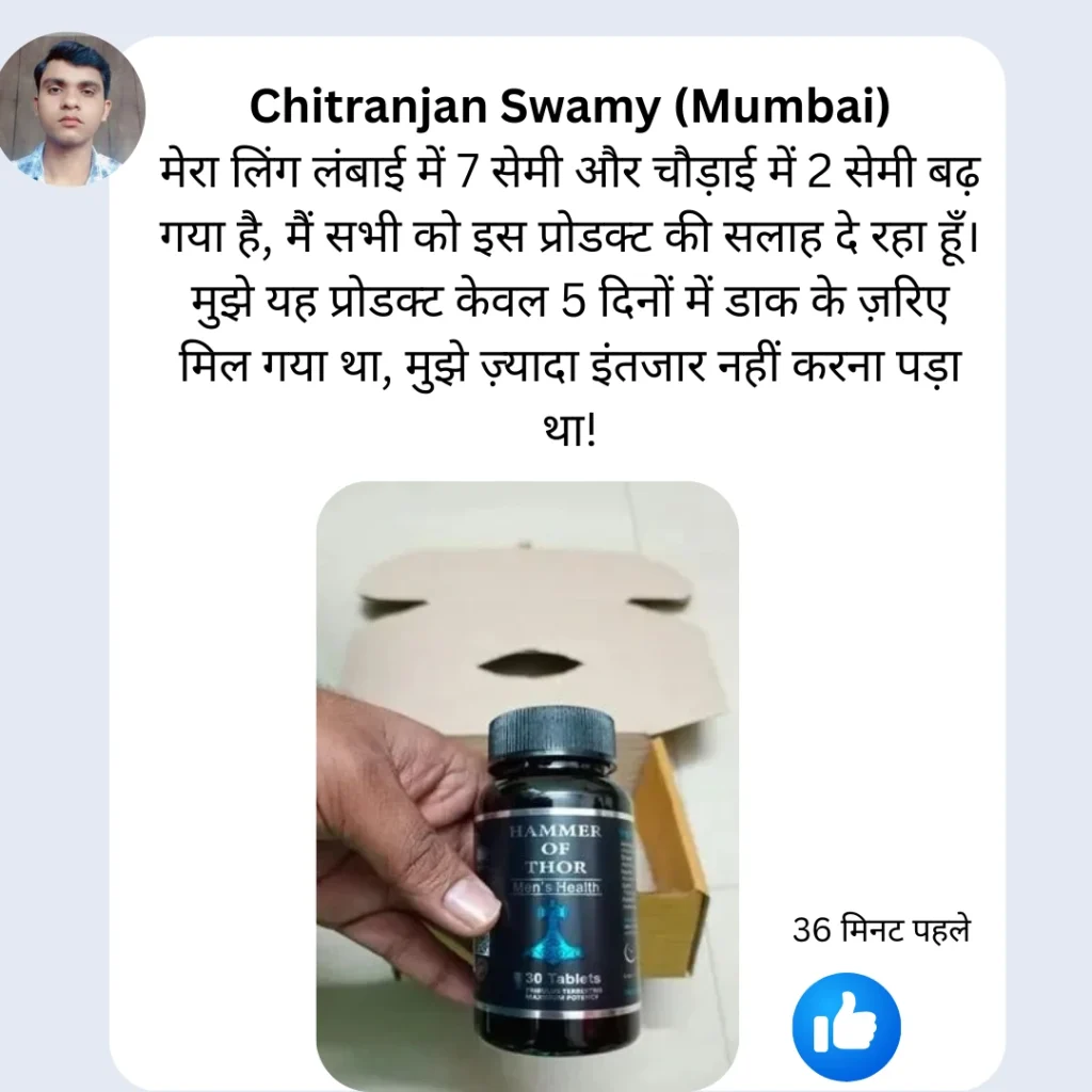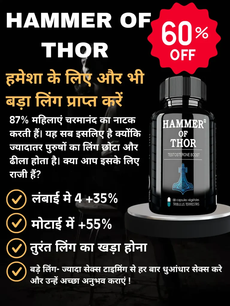 Hammar Of Thor Tablet कमजोरी मिटाता है। जोश, उत्तेजना, टाइमिंग और लिंग में कड़कपन उत्पन्न करता है जिसकी वजह से पुरुषों के सेक्स प्रदर्शन में जोरदार उछाल देखने को मिलता है। सेक्स परफॉरमेंस उस स्तर की हो जाती है जिससे पति-पत्नी के रिश्ते में सिर्फ मिठास रहे। यानि इससे सेक्स प्रदर्शन और पति-पत्नी के रिश्ते दोनों अच्छे हो जाते है।